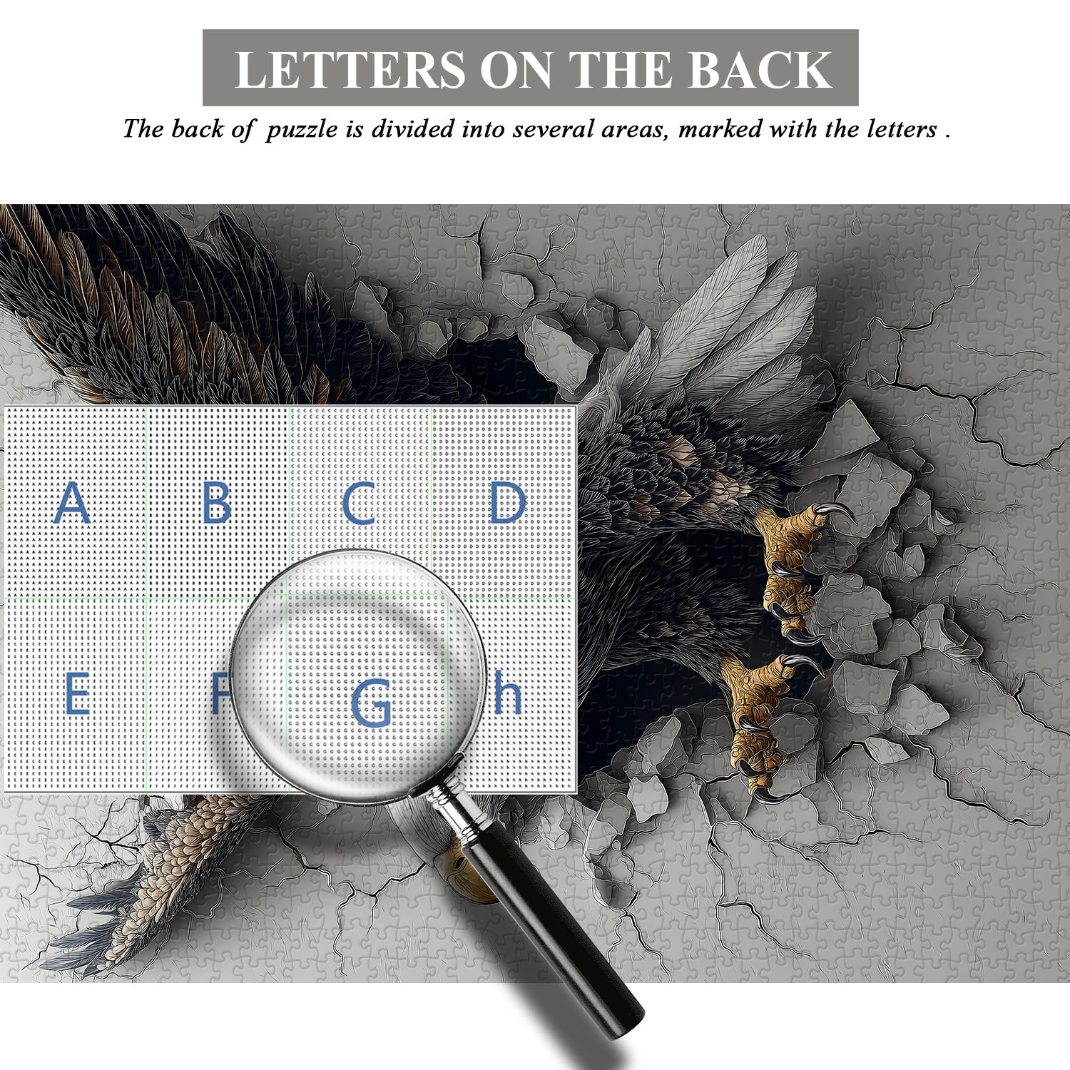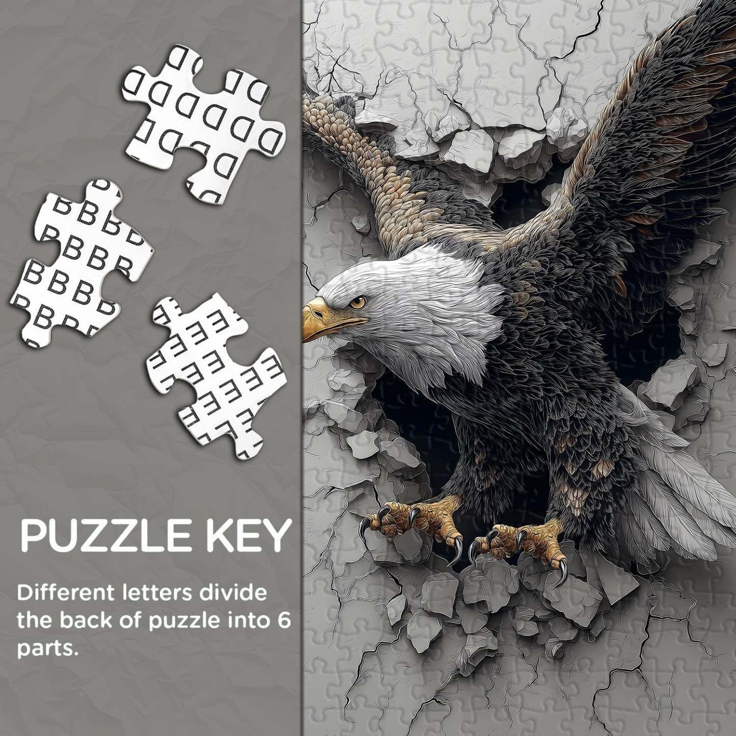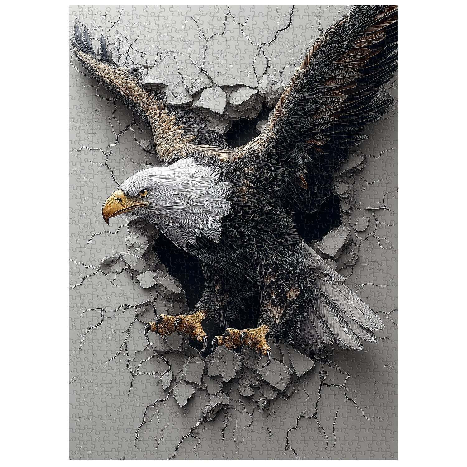 Action & Scene: The eagle is bursting through a cracked, gray concrete wall, with debris and fractures surrounding the breakage, creating a strong sense of movement and impact.