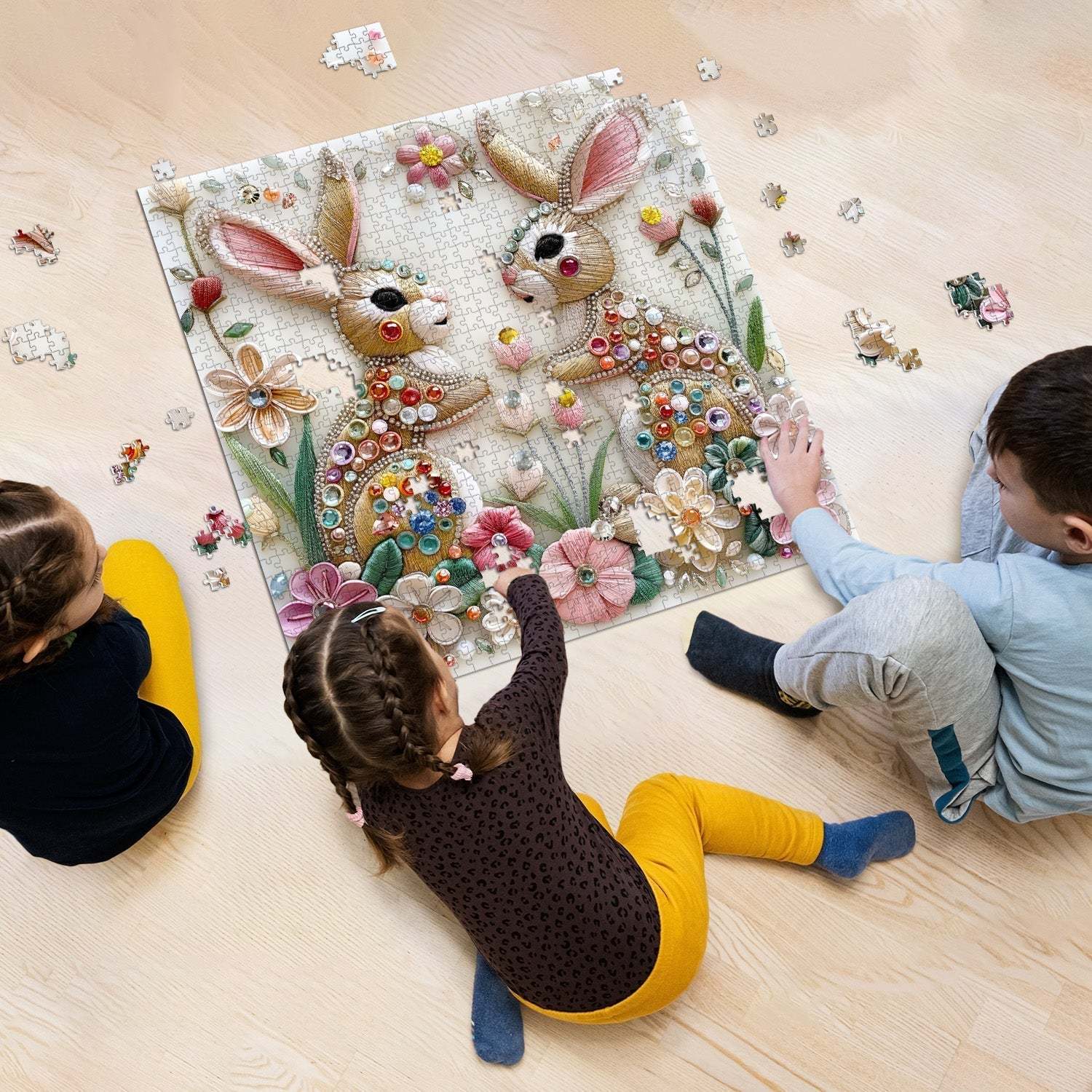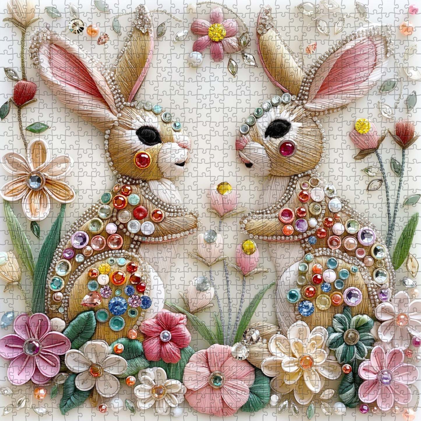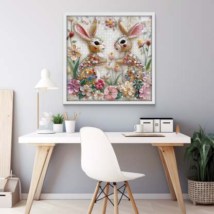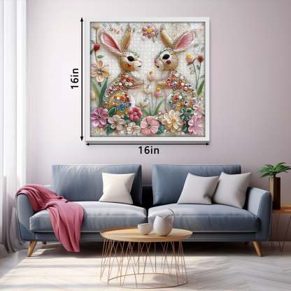 Floral Accents for a Natural Touch: The background is adorned with delicate embroidered flowers, creating a lush, vibrant environment around the rabbits.