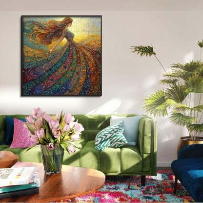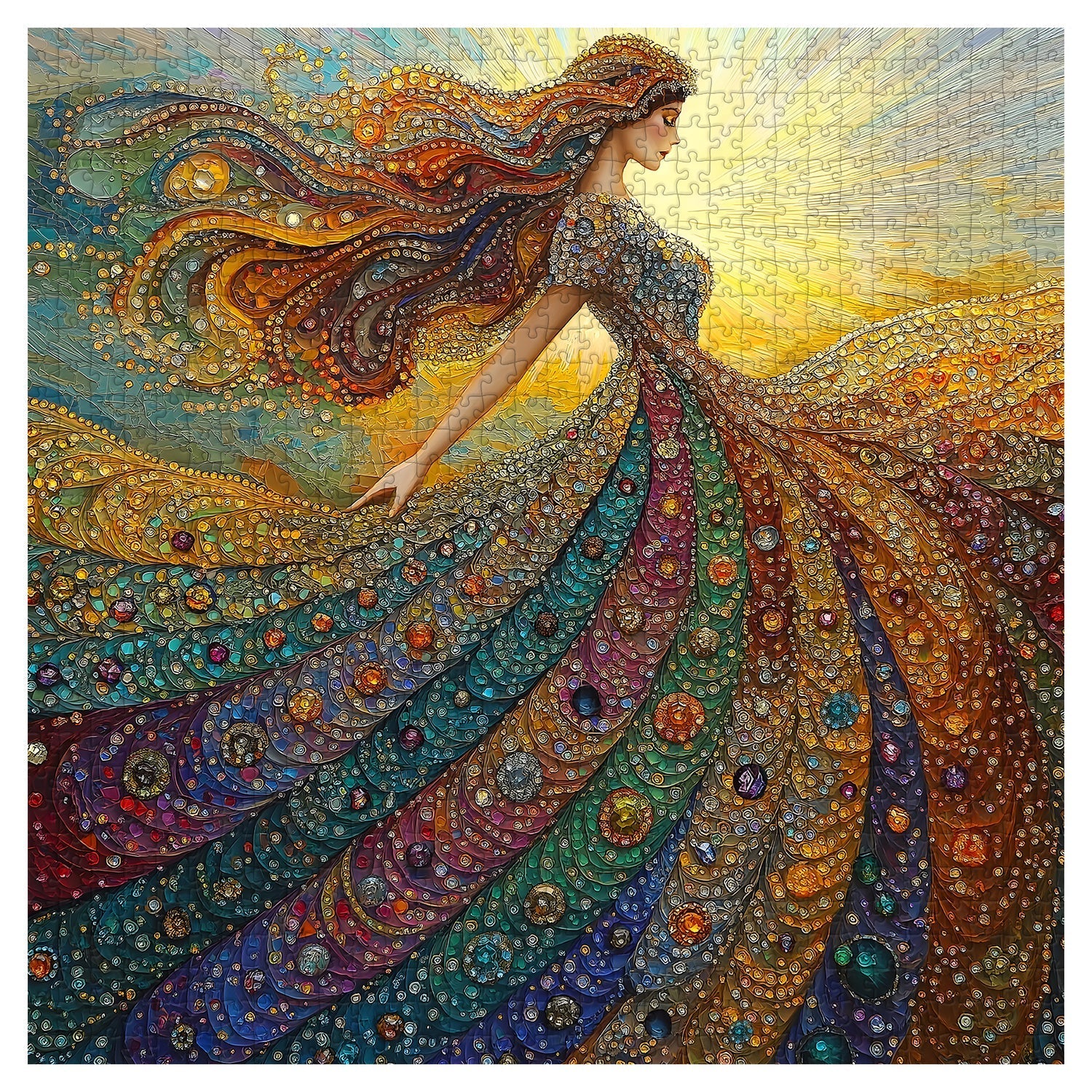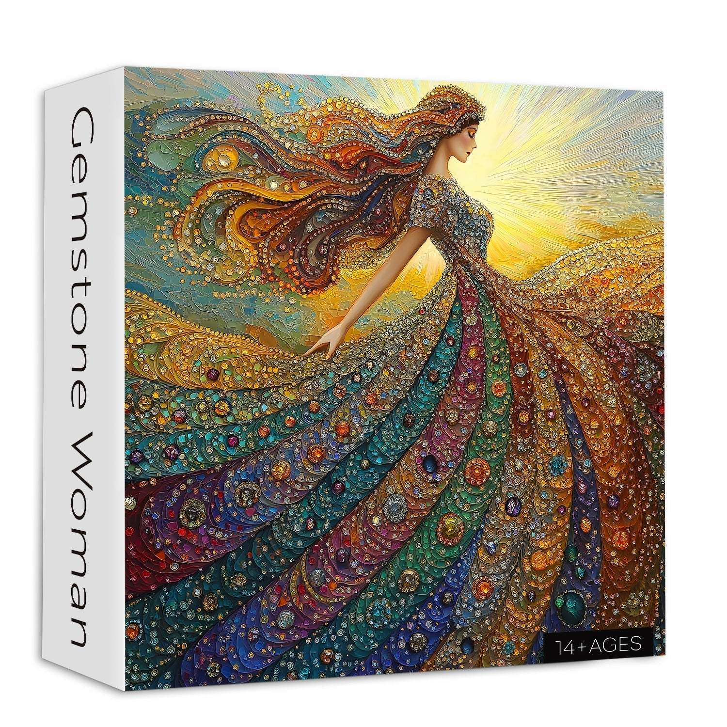 Dazzling Artwork – Featuring a stunning woman in a gemstone-inspired gown, radiating vibrant colors and sparkling jewel-like details that feel alive.