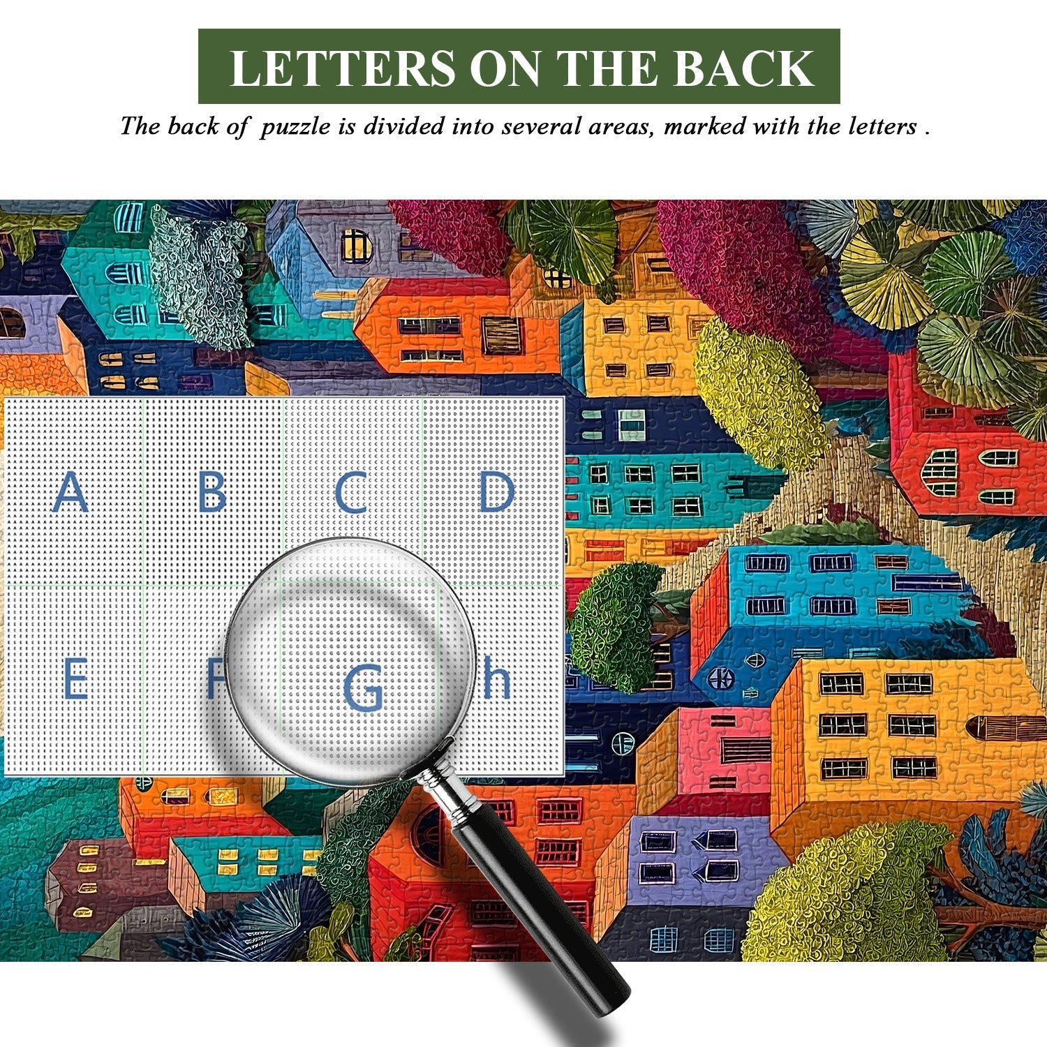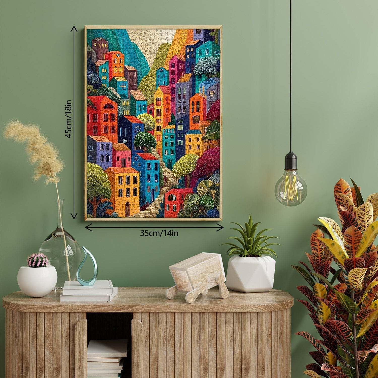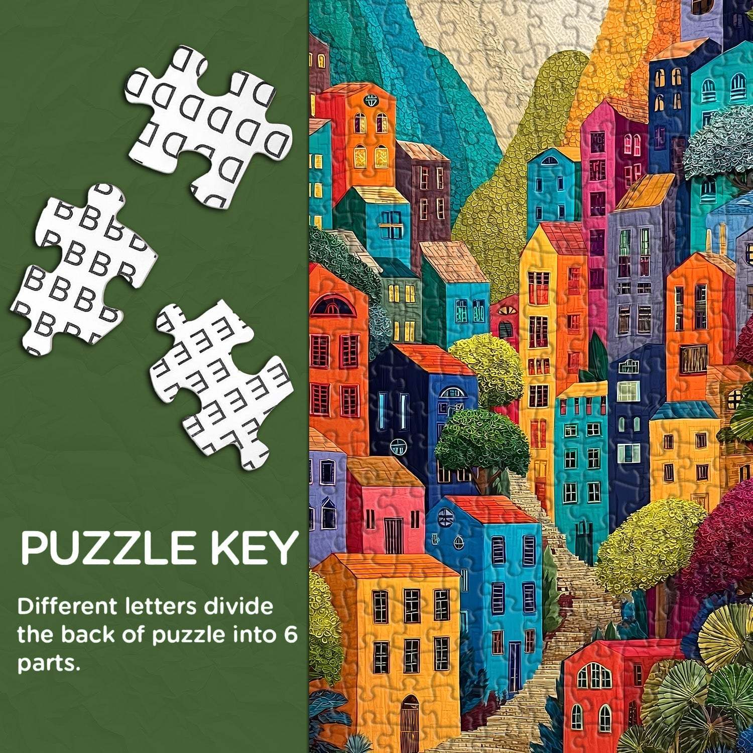 Vibrant Hilltop Townscape: The image depicts a colorful, densely packed town built on a hillside, with buildings in bold hues (red, orange, blue, pink, purple) that create a lively, whimsical palette.