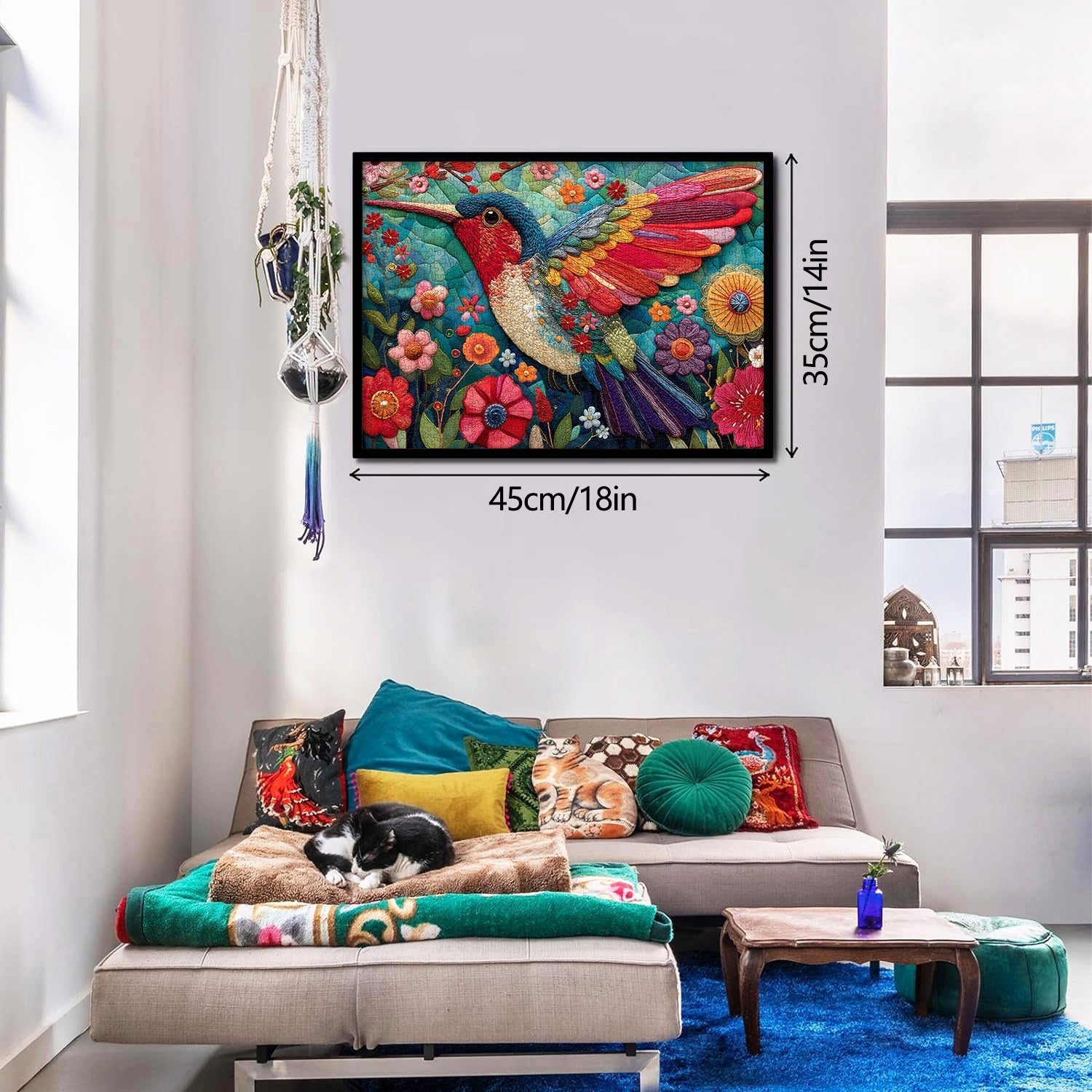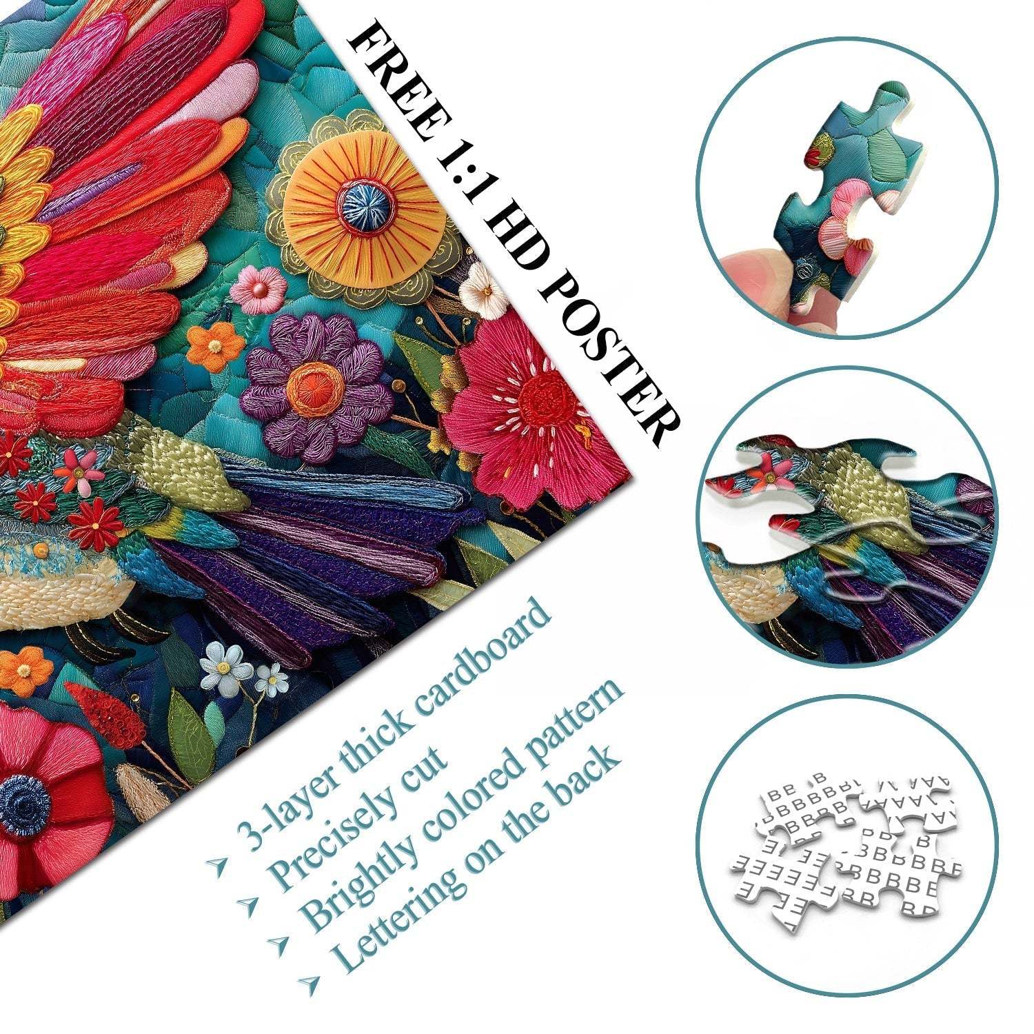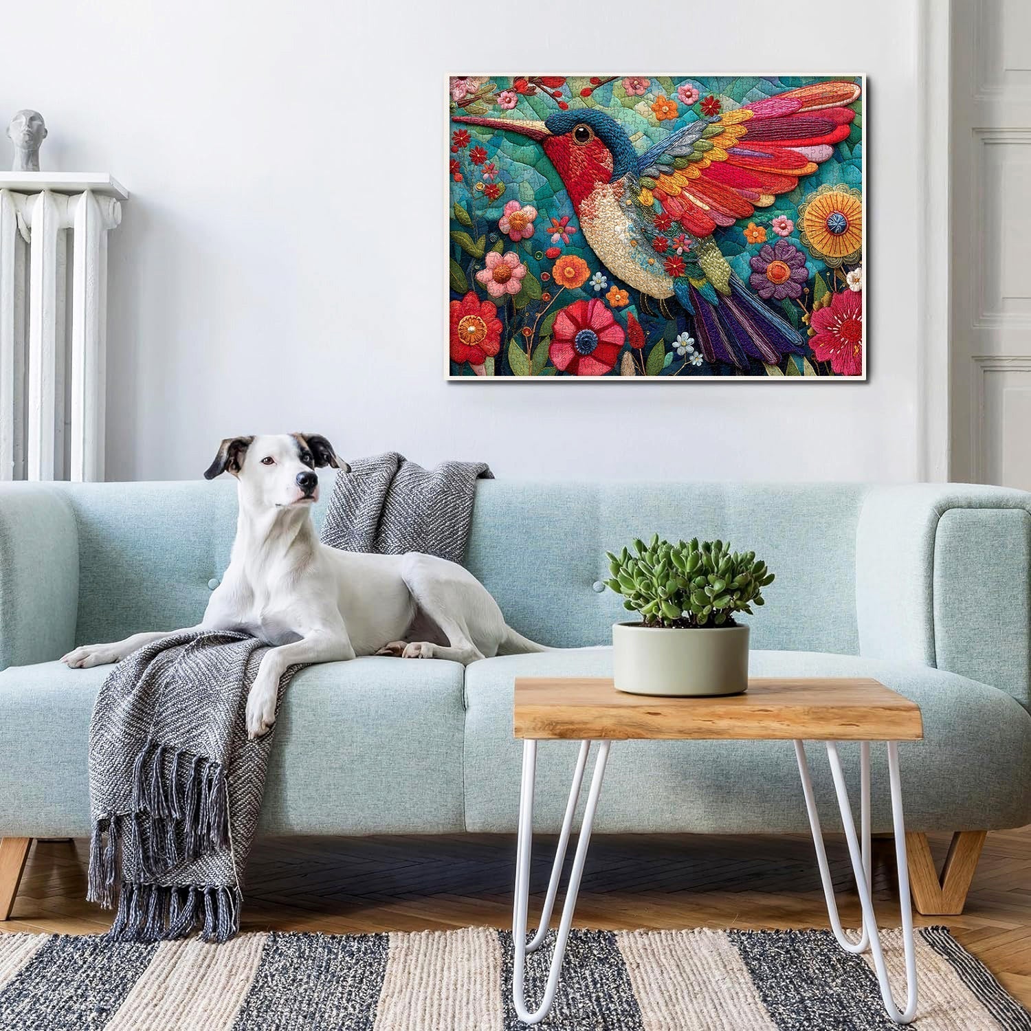 Color Palette: It uses a rich, textured color scheme— the hummingbird displays iridescent hues of red, blue, yellow, and green, while the flowers pop in bold reds, pinks, and oranges against a teal, quilted base.